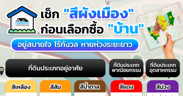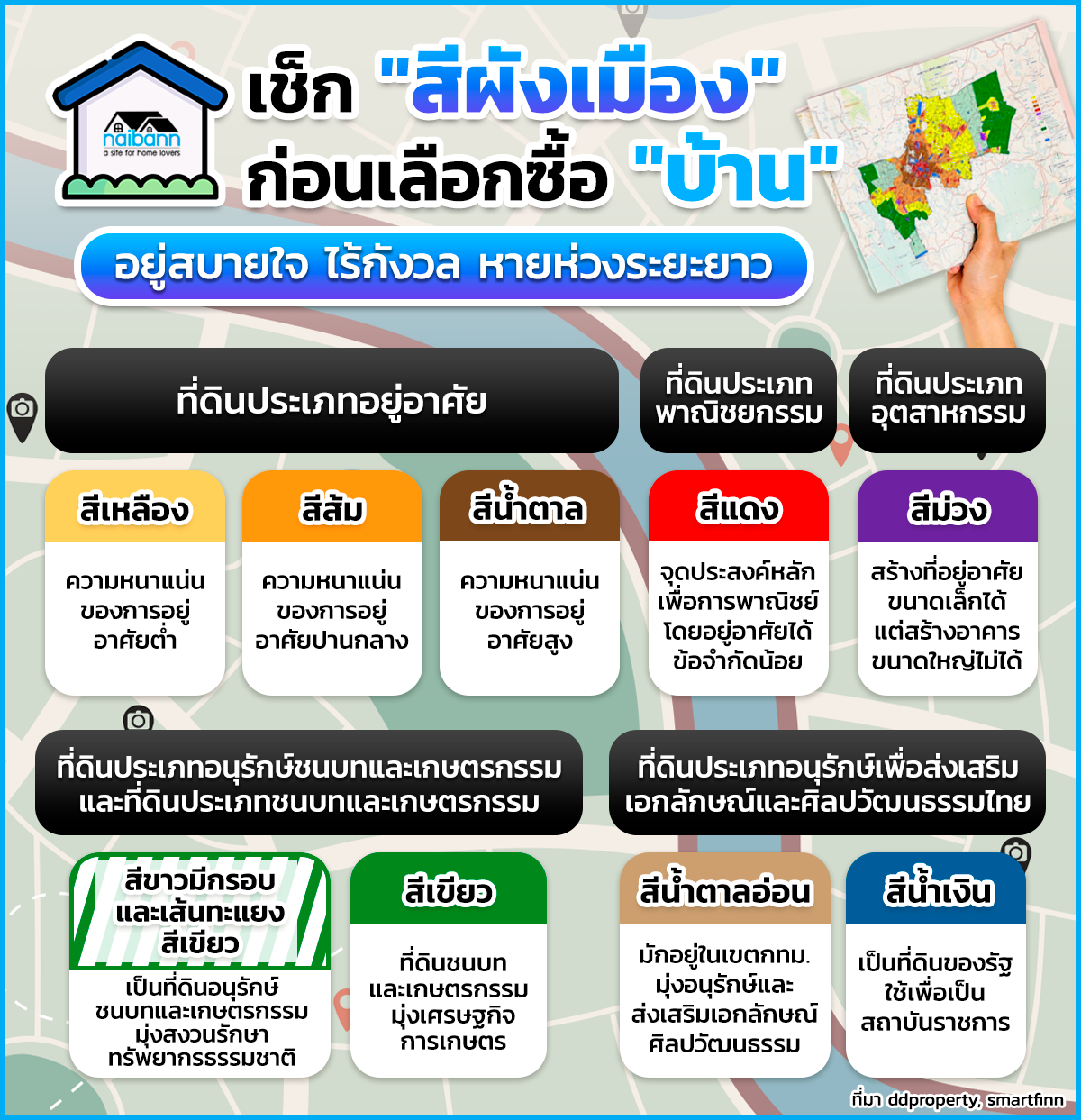 ก่อนอื่นต้องรู้ก่อนว่า ในแต่ละจังหวัดของไทยจะมีการจัดสรรผังเมือง โดยแบ่งตามสี ซึ่งแต่ละสีมีความหมายของมัน ดูให้เป็น เพื่อผลประโยชน์ของเราเอง