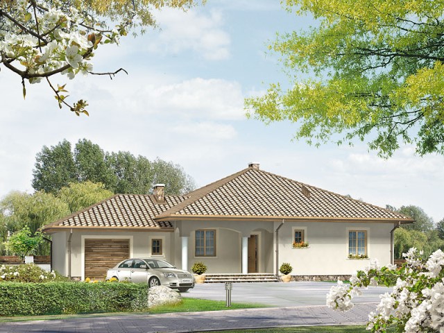 ต้วบ้านออกแบบเรียบง่าย แต่มีลูกเล่นที่จังหวะของผนังฉาบเรียบสีขาวล้วน จับคู่กับหลังคาทรงปั้นหยา โทนสีเทาๆ ดูเรียบง่าย ตกแต่งแบบง่ายๆ ดูคุ้นตาคนไทยเป็นอย่างมาก และมีเฉลียงหน้าบ้านอีกด้วย