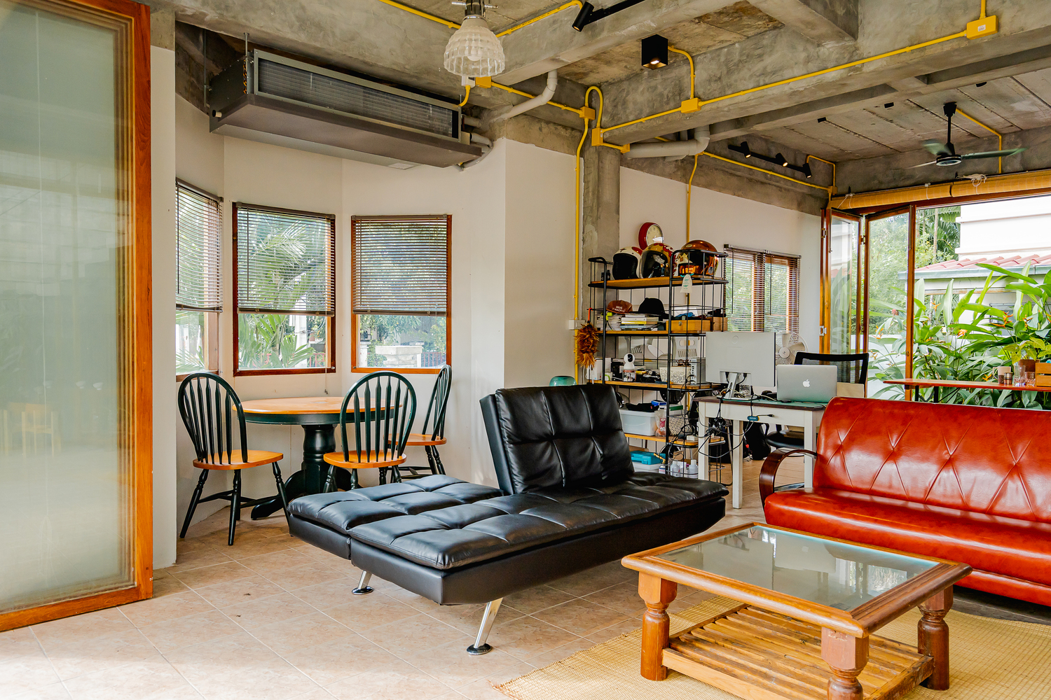 ภายในห้องนั่งเล่นจะมีโซฟาบุหนังตั้งอยู่อย่างโดดเด่น ซึ่งก็เข้ากันได้ดีกับของดิบเท่แบบอินดัสเทรียลลอฟท์ที่เป็นธีมหลักของบ้าน