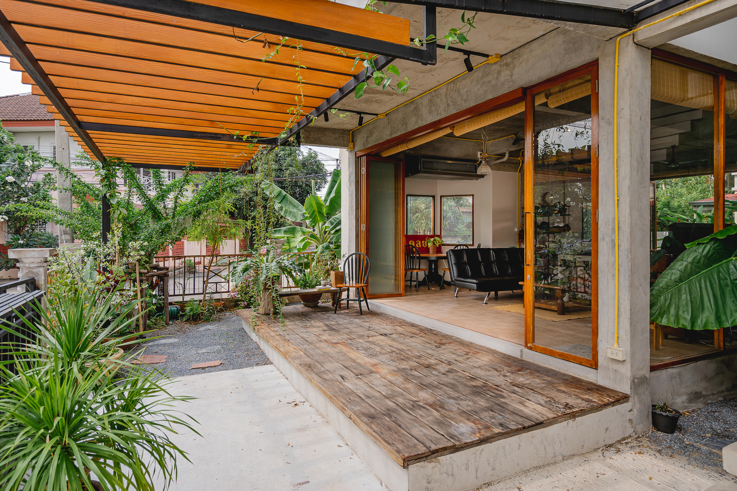 ประตูและหน้าต่างของบ้านหลังนี้ มีวัสดุเป็นไม้สักเก่า ซึ่งจะมีคุณสมบัติทนความชื้นได้ดี ซึ่งเหมาะกับสภาพอากาศร้อนชื่นของเมืองไทยได้เป็นอย่างดี