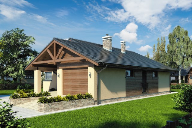 ต้วบ้านออกแบบเรียบง่ายแบบหน้าแคบ ลึกไปด้านหลัง จับคู่กับหลังคาทรงจั่ว ลดระดับให้เกิดมิติสวยงาม ดูเรียบง่าย ผสมวัสดุจากไม้และอิฐมอญ ตกแต่งแบบง่ายๆ ดูคุ้นตาคนไทยเป็นอย่างมาก และมีเฉลียงหน้าบ้านอีกด้วย