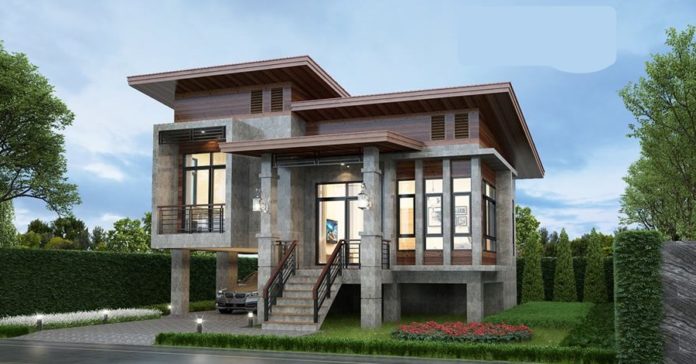 นี่เป็นผลงานการออกแบบจาก แบบบ้านแสงตะวัน มาในลักษณะของบ้านชั้นครึ่งยกพื้นสูง โครงสร้างคอนกรีตออกแบบในรูปทรงเหลี่ยมหน้ากว้าง ภายนอกตกแต่งในดีไซน์ปูนเปลือยขัดมัน มุงหลังคาเมทัลชีททรงเพิงหมาแหงน