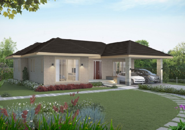 ตัวบ้านขนาดชั้นเดียว เลือกใช้หลังคาทรงปั้นหยามุงด้วยกระเบื้องสีดำ ผนังภายนนกแต่งด้วยเซรามิคโทนสีน้ำตาลอ่อน เข้ากับสีของหลังคาได้อย่างลงตัว มีพื้นที่จอดรถใต้ชายคารองรับรถยนต์ถึง 2 คัน ทางเข้ามีเฉลียงพื้นหินอ่อนด้วย