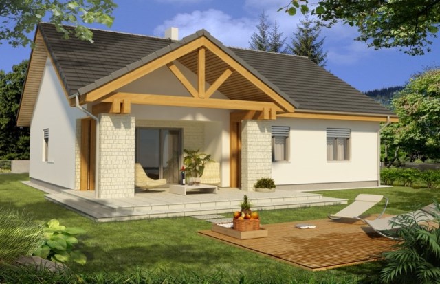 ตัวบ้านโครงสร้างคอนกรีต ที่ออกแบบรูปทรงเรียบง่าย ใช้หลังคทรงจั่วแบบภูมิฐาน สวยงามแบบผู้ใหญ่ชื่นชอบ ตกแต่งคู่กับไม้ เว้นจังหวะให้มีเฉลียง แชร์ฟังก์ชันไปยังสนามหญ้าหลังบ้าน