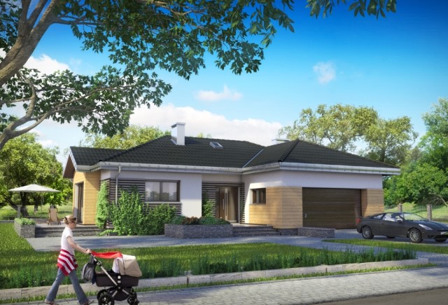 ตัวบ้านโครงสร้างคอนกรีต ออกแบบแปลนบ้านที่ดูร่วมสมัย ผนังคอนกรีต โทนสีเหลืองพาสเทลตกแต่งเพิ่มเติม ตกแต่งด้วยไม้ตามจุดต่างๆ จับคู่กับหลังคาทรงจั่วผสมทรงปั้นหยา ได้ทั้งความสวยงามและความภูมิฐานอีกด้วย