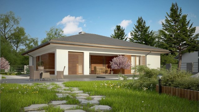ตัวบ้านโครงสร้างคอนกรีต ออกแบบที่เรียบง่าย จับคู่กับหลังคาทรงปั้นหยาสีอ่อนๆ เสริมความสวยงามไปกับผนังทูโทน ไม้สีน้ำตาลและผนังฉาบเรียบสีขาว สะท้อนรสนิยมของคนไทย และปรับเข้ากับบรรยากาศในบ้านเราได้ดีเยี่ยม