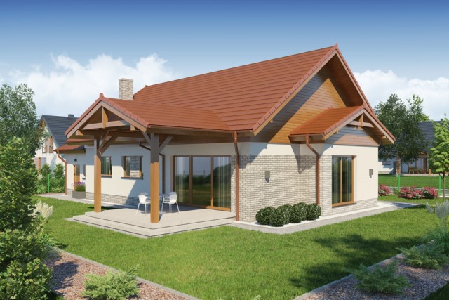 ตัวบ้านโครงสร้างคอนกรีต ออกแบบแปลนบ้านที่เรียบง่าย แปลนบ้านทรงสี่เหลี่ยม ตกแต่งด้วยไม้บนตัวผนังคอนกรีตสีขาวครีม จับคู่กับหลังคาทรงจั่วสีแดงสด ได้ทั้งความสวยงามและความภูมิฐานอีกด้วย
