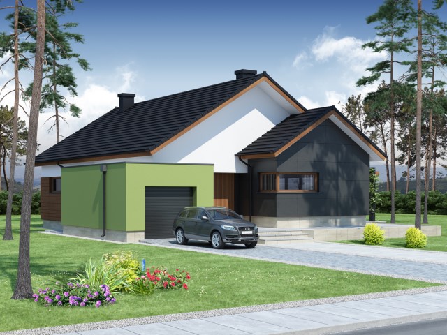 ตัวบ้านโครงสร้างคอนกรีต ออกแบบให้เด่นชัดกับงานโครงสร้าง เป็นบ้านชั้นเดียว รูปทรงกล่องเรียบง่าย แต่กีไซน์หลังคาทรงจั่ว และตกแต่งด้วยโทนสีขาว ครีม และวัสดุจากอิฐและไม้เช่นกัน