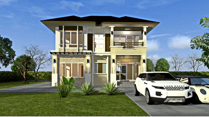 ลักษณะบ้านขนาดสองชั้น รูปทรงได้สมมาตร ผนังภายนอกตกแต่งด้วยโทนสีอ่อนอย่างสีครีม โดยตัวบ้านชั้นล่างเลือกเฉดสีที่เข้มกว่าชั้นบน ทำให้ช่วยป้องกันตัวบ้านจากคราบสกปรกได้เป็นอย่างดี ทางด้านหลังคาของบ้าน เลือกใช้หลังคารูปทรงปั้นหยา มุงด้วยกระเบื้องแบบเรียบโทนสีเข้ม