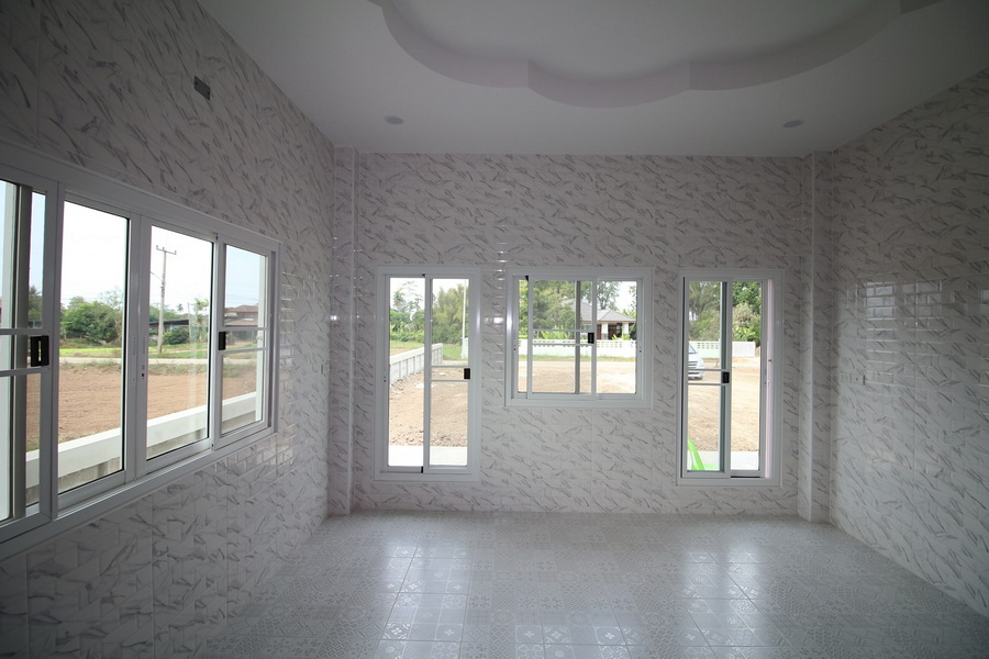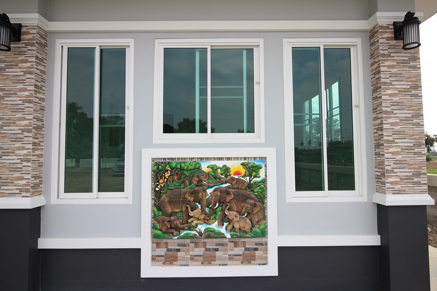 บริเวณรอบตัวบ้านถูกติดตั้งด้วยประต่างกระจกใสทรงสูง เพื่อให้ภายในบ้านสามารถถ่ายเทอากาศได้อย่างสะดวก จึงเหมาะกับสภาพอากาศร้อนของเมืองไทย