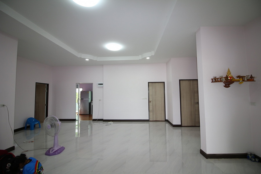 เมื่อเข้ามาภายในบ้าน เราก็จะพบกับห้องโถงขนาดใหญ่ของบ้าน ซึ่งมีพื้นที่กว้าง สามารถแบ่งการใช้งานได้ตามต้องการ ด้านการตกแต่ง ผนังภายในจะเลือกใช้โทนสีขาวครีมที่ให้ความสว่างมีมิติ