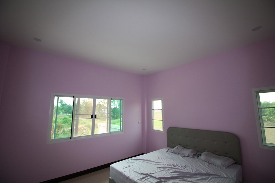 ทางด้านของห้องนอนนั้น ภายในมีพื้นที่ใช้สอยที่พอประมาณ ผนังห้องถูกทาด้วยสีชมพูที่ให้บรรยากาศอ่อนหวาน เหมาะกับเป็นห้องนอนเด็กผู้หญิง