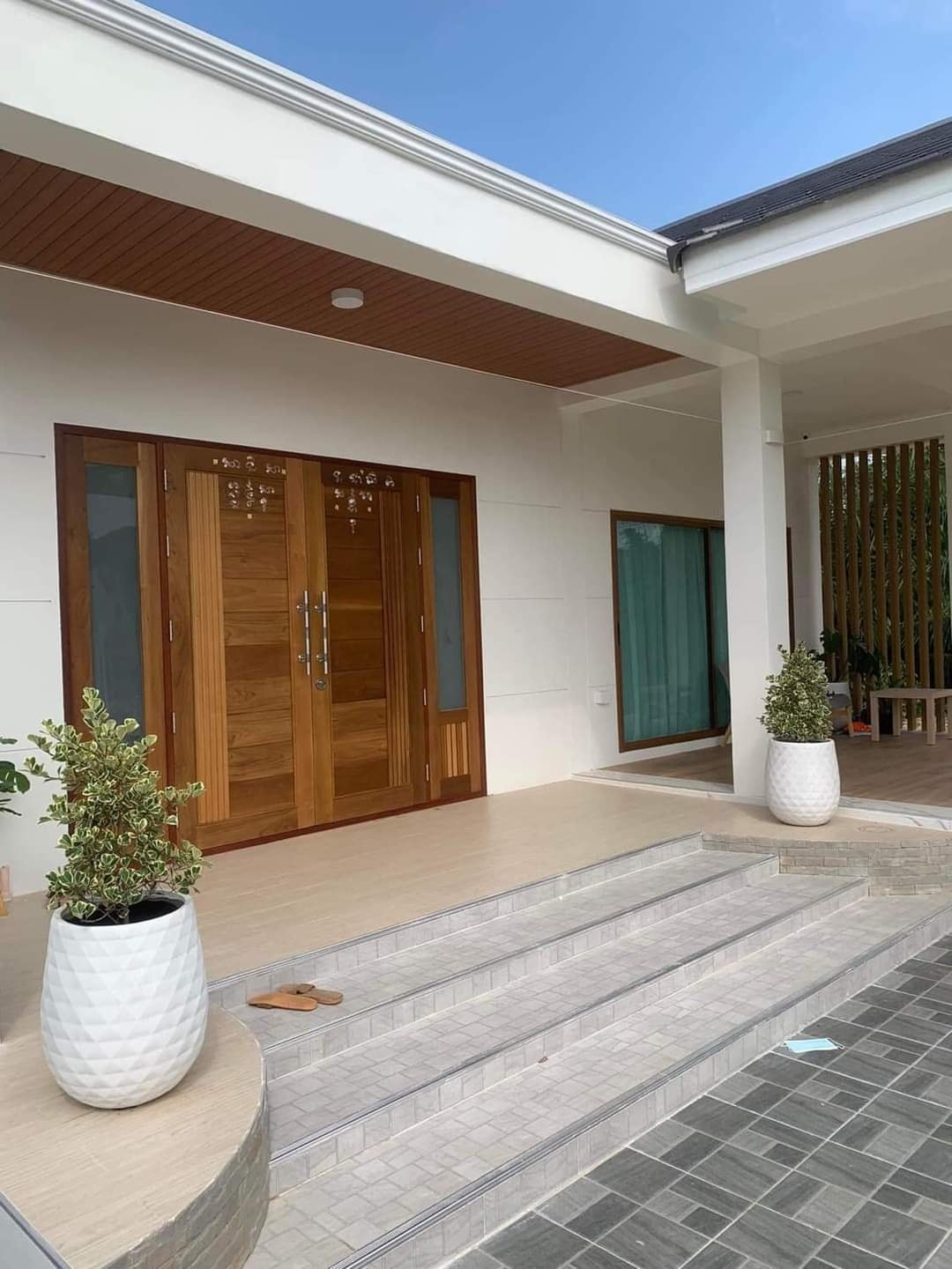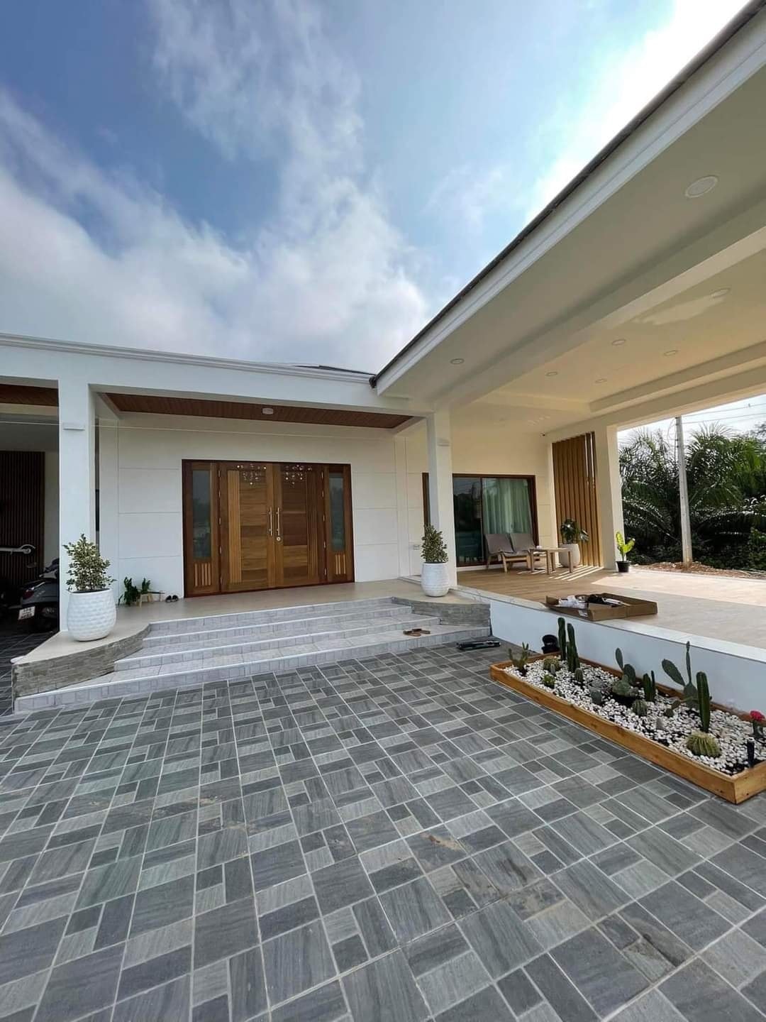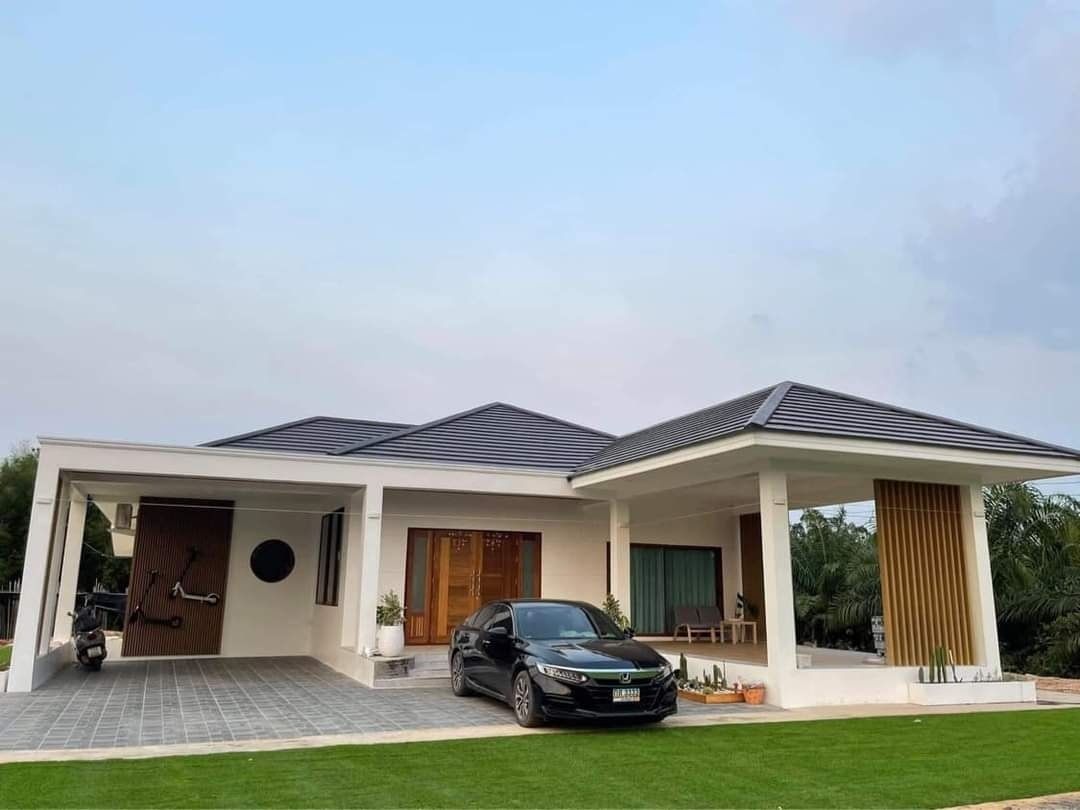 ตัวบ้านเป็นบ้านแบบชั้นเดียวยกพื้นขึ้นเตี้ย ๆ งานออกแบบก็จะเน้นดีไซน์รูปลักษณ์ที่ทันสมัย มีหลังคาทรงปั้นหยาที่เหมาะกับสภาพอากาศของบ้านเรา