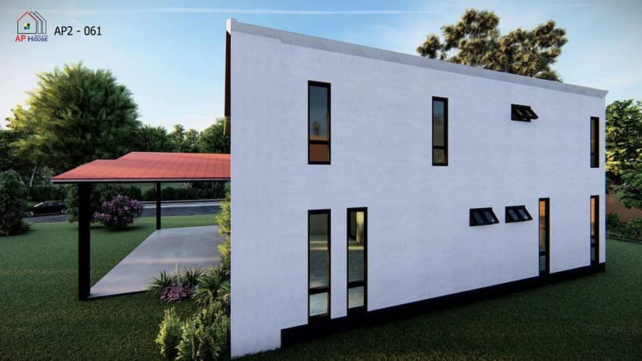 แบบบ้านสไตล์คอนเทมโพรารีหลังนี้ประกอบไปด้วย 2 ห้องนอน 3 ห้องน้ำ 1 ห้องโถงรับแขก 1 ห้องโถงนั่งเล่น 1 ห้องหมา 1 ห้องครัว พร้อมชั้นลอยและที่จอดรถ แบบบ้านสำเร็จราคา 3,900 บาท