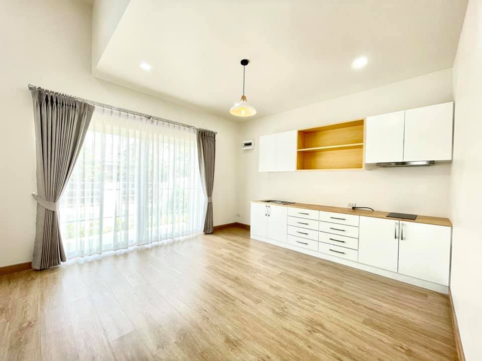 ในขณะที่อีกด้านหนึ่งก็จะเป็นพื้นที่ของห้องครัว โดยจะติดตั้งด้วยเคาน์เตอร์แบบติดผนัง พร้อมกับปล่องดูดควันที่จะช่วยอำนวยความสะดวกในการทำอาหารได้เป็นอย่างดี