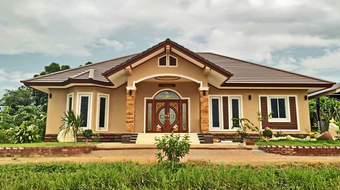 บ้านหลังเป็นผลงานจากคุณ ช่างดล โครงหลังคาเหล็ก ลิสซิ่ง ลักษณะเป็นบ้านชั้นเดียวยกพื้นสูง โครงสร้างคอนกรีต เสริมเหล็ก ผนังภายนอกแต่งแต้มโทนสีครีม ตัดกับตัวฐานลวดลายหินเทียมสีเข้ม เสริมด้วยเสากรุแต่งหินเทียมให้ความสวยงามเป็นธรรมชาติ หลังคามุงกระเบื้องนิวสไตล์ทรงจั่วกึ่งปั้นหยา
