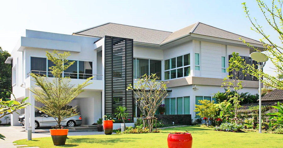 บ้านหลังนี้เป็นผลงานจาก householder ลักษณะเป็นบ้านสองชั้นรูปตัวแอล L-Shape โครงสร้างคอนกรีต เสริมเหล็ก ผนังภายนอกแต่งแต่มโทนสีขาวทั้งหมด ตัดด้วยครีบปูนสีเทาอ่อน หลังคามุงกระเบื้องแผ่นเรียบทรงปั้นหยา พื้นที่รอบบ้านปูสนามหญ้าเขียวชอุ่ม ประดับด้วยต้นไม้สูงใหญ่ช่วยเพิ่มความมีชีวิตชีวาให้กับบ้าน