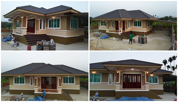 ลักษณะบ้านชั้นเดียวยกพื้น โครงสร้างคอนกรีต ผนังภายนอกเลือกใช้โทนสีออกน้ำตาล ซึ่งมอบบรรยากาศดีและความรู้สึกที่อบอุ่น ให้ผู้อยู่อาศัยได้พักผ่อนกันอย่างเต็มที่ หลังคาออกแบบด้วยรูปทรงปั้นหยาเล่นระดับ มุงด้วยกระเบื้องลอนสีน้ำตาล บริเวณหน้าบ้านกรุแต่งด้วยประตูไม้โอ๊คแดง รับกับโทนสีของบ้านได้เป็นอย่างดี