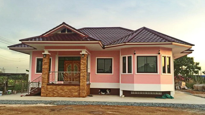 บ้านหลังนี้เป็นผลจากคุณ Note Freedom ลักษณะเป็นบ้านชั้นเดียวยกพื้นสูง บริเวณใต้ถุนกรุอิฐช่องลมไว้เพื่อช่วยในการกระจายความร้อนออกจากตัวบ้าน โครงสร้างบ้านคอนกรีตเสริมเหล็กตกแต่งในโทนสีชมพู เพิ่มลูกเล่นด้วยเสากรุกระเบื้องหินทรายสีธรรมชาติ มุงหลังคากระเบื้องทรงจั่วกึ่งปั้นหยาดีไซน์สวยงาม