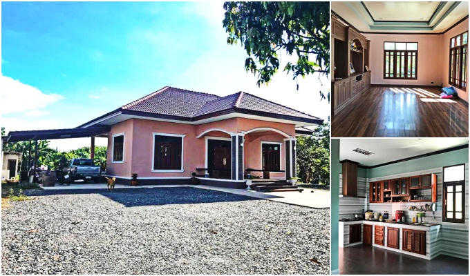 ลักษณะบ้านชั้นเดียวยกสูงจากพื้นเล็กน้อย ผนังก่ออิฐฉาบปูนแต่งแต้มด้วยโทนสีเบจอมชมพู ตัวเสากรุแต่งด้วยกระเบื้องหินเทียมสีเทาอ่อนช่วยให้บ้านดูมีลูกเล่นมากขึ้น หลังคามุงกระเบื้องลอนทรงปั้นหยาสีแดงรับกับสีของบ้าน บริเวณหน้าบ้านมีเฉลียงขนาดพอเหมาะ พร้อมก่อม้านั่งไว้โดยรอบ จัดเป็นมุมพักผ่อนรับลมธรรมชาตินอกบ้าน