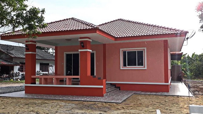 ลักษณะบ้านขนาดชั้นเดียว ออกแบบด้วยสไตล์คอนเทมโพรารี่ รูปทรงยอดนิยม หลังคาของบ้านออกแบบด้วยรูปทรงปั้นหยา มุงด้วยกระเบื้องลอนโทนสีเข้ม ผนังภายนอกตกแต่งด้วยโทนสีที่สดใส คือ สีส้ม และสีครีม
