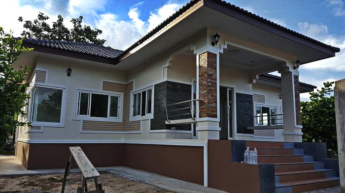 ลักษณะบ้านขนาดชั้นเดียว โครงสร้างคอนกรีตทั้งหลัง ตัวบ้านออกแบบยกพื้นสูง การออกแบบใช้รูปทรงสไตล์คอนเทมโพรารี่ที่สวยงาม แต่ก่อสร้างได้ง่าย เป็นที่นิยม และมีความมั่นคงแข็งแรง ผนังภายนอกเลือกใช้โทนสีครีม แซมด้วยสีน้ำตาล ให้บรรยากาศที่ดูอบอุ่น หลังคาของบ้านดีไซน์ด้วยรูปทรงปั้นหยา มุงด้วยกระเบื้องลอนสีเข้ม