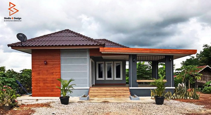 บ้านหลังนี้เป็นผลงานจาก Studio B-Design ก่อสร้างขึ้นที่อ.บ้านดุง จ.อุดรธานี ตัวบ้านยกพื้นชั้นเดียวออกแบบในรูปทรง L-Shape ผนังก่ออิฐฉาบปูนแต่งเติมโทนสีเทารับกับผนังไม้เทียมสีเข้ม โดดเด่นด้วยหลังคากระเบื้องลอนทรงปั้นหยา