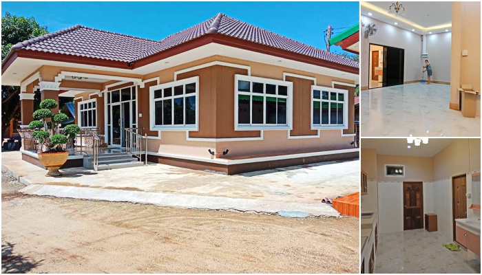 บ้านหลังเป็นผลงานจากคุณ ธาดาพงศ์ ฝอยทอง เป็นบ้านชั้นเดียวขนาดกลา ผนังภายนอกตกแต่งด้วยโทนสีครีมแซมสีน้ำตาล หลังคามุงกระเบื้องลอนทรงปั้นหยาสีน้ำตาลรับกับสีของตัวบ้าน ประดับเพิ่มความมีชีวิตชีวาด้วยต้นไม้กระถาง ช่วยสร้างบรรยากาศสดชื่นและผ่อนคลายได้มากขึ้น
