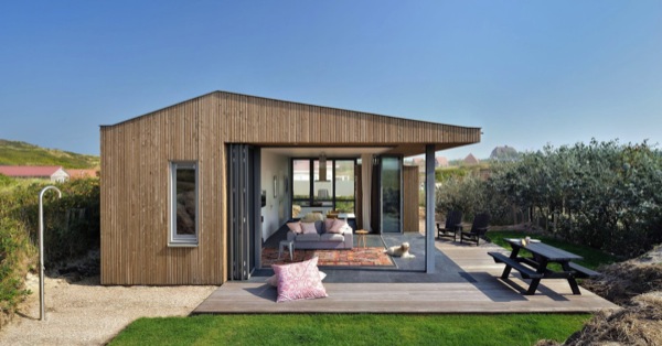 ตัวบ้านรูปทรงเรียบง่าย สวยสะดุดตาไปกับผนังไม้ตีชิดแนวตั้ง ตกแต่งไปกับผนังกระจกบานใหญ่ ไว้กลางบ้าน หลังคาทรงจั่วชายคาสั้น ดูเรียบง่าย เข้ากับแบบบ้านโมเดิร์นเป็นอย่างดี