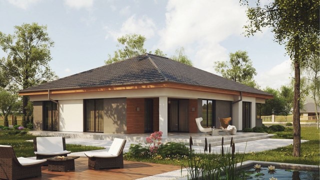 ตัวบ้านโครงสร้างคอนกรีต ออกแบบรูปทรงที่คุ้นตาชาวไทย จับคู่ไปกับหลังคาทรงปั้นหยาโทนสีน้ำตาล ดูเรียบง่าน งามตาและส่งเสริมให้บ้านดูภูมิฐานมากขึ้น ตกแต่งจากไม้ในส่วนของประตูหน้าต่างอีกด้วย สร้างความงามให้แก่ตัวบ้านได้ดีเยี่ยม และเป็นเอกลักษณ์ที่สุด