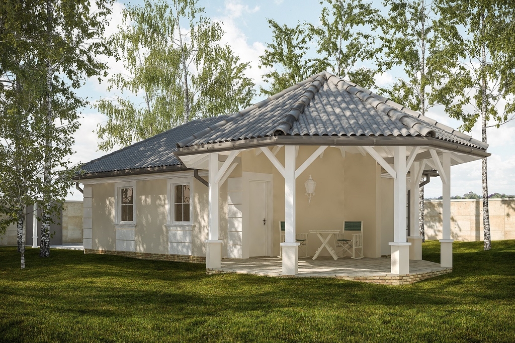 ตัวบ้านขนาดเล็ก ใช้โครงสร้างคอนกรีต ที่ออกแบบรูปทรงเรียบง่าย จังคู่กับหลังคาทรงปั้นหยา ได้รับความภูมิฐานเสริมมาเล็กน้อย ตกแต่งผนังจากไม้และอิฐโชว์แนวสวยงาม ยกพื้นบ้านให้มีมิติ รับมุมมองของบ้านที่ดีขึ้น โดดเด่นไปกับซุ้มหน้าบ้าน แปดเหลี่ยม สร้างเป็นเฉลียงรองรับกิจกรรมได้มากมาย