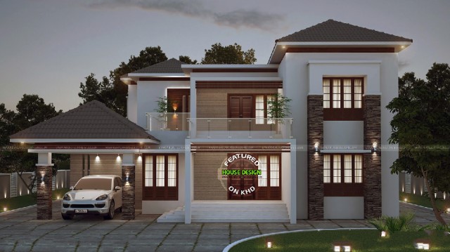 ดีไซนหลังคาปั้นหยา ผสมหลังคาแบน ของบ้านรูปทรงกล่อง วัสดุจากไม้ตกแต่งบนพื้นฐานของคอนกรีตฉาบเรียบสีขาวทั้งหลัง