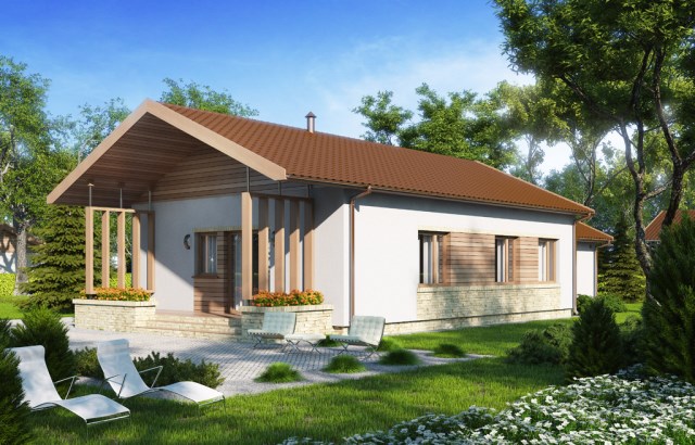ใช้โครงสร้างคอนกรีต ที่ออกแบบรูปทรงเรียบง่ายที่สุด มาพร้อมซุ้มไม้หน้าบ้าน ทำเป็นพื้นที่พักผ่อนกลางแจ้งอีกด้วย หลังคาจั่วจากไม้ เปิดรับหน้าบ้านดูดีเชียวละ