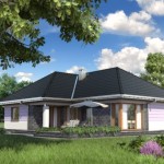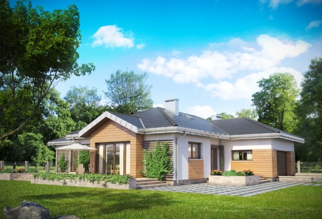 บ้านโครงสร้างคอนกรีต ออกแบบแปลนบ้านที่เรียบง่าย เลือกใช้หลังคาทรงปั้นหยา สีเข้ม สร้างความสวยงามและความภูมิฐานที่ถูกใจคนไทย ตกแต่งด้วยไม้ในส่วนของกรอบประตูหน้าต่าง มาพร้อมเฉลียงรองรับอีกด้วย