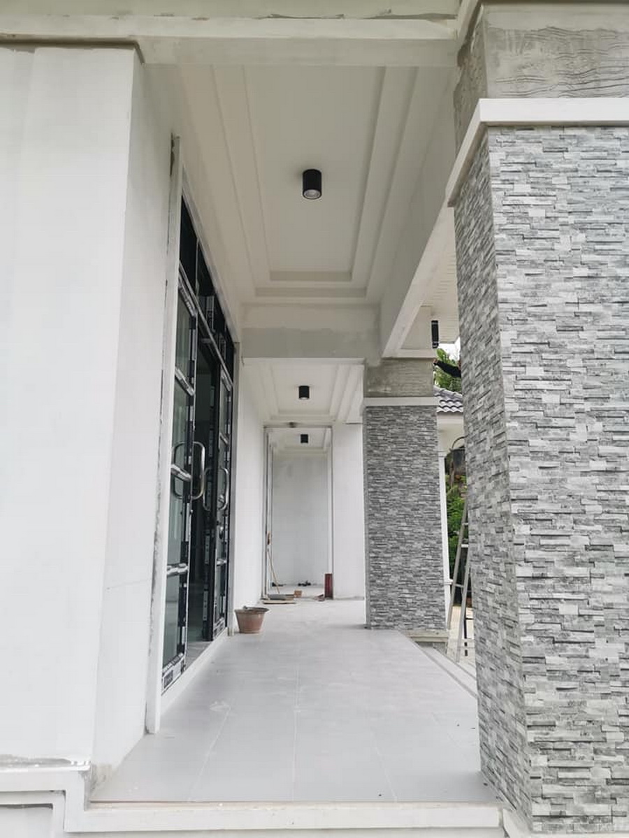 บริเวณหน้าบ้านอกแบบเป็นเฉลียงที่ออกแบบเป็นแนวยาวตลอดตัวบ้าน พร้อมความโปร่งโล่งที่สามารถตกแต่งและใช้งานได้อย่างหลากหลาย