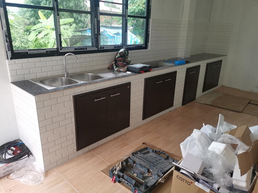 ทางด้านของห้องครัว เป็นห้องที่จะเน้นการใช้สอย โดยออกแบบหน้าต่างบ้านใหญ่ช่วยระบายกลิ่นและควัน พร้อมกับติดตั้งเคาน์เตอร์ครัวแบบติดผนัง