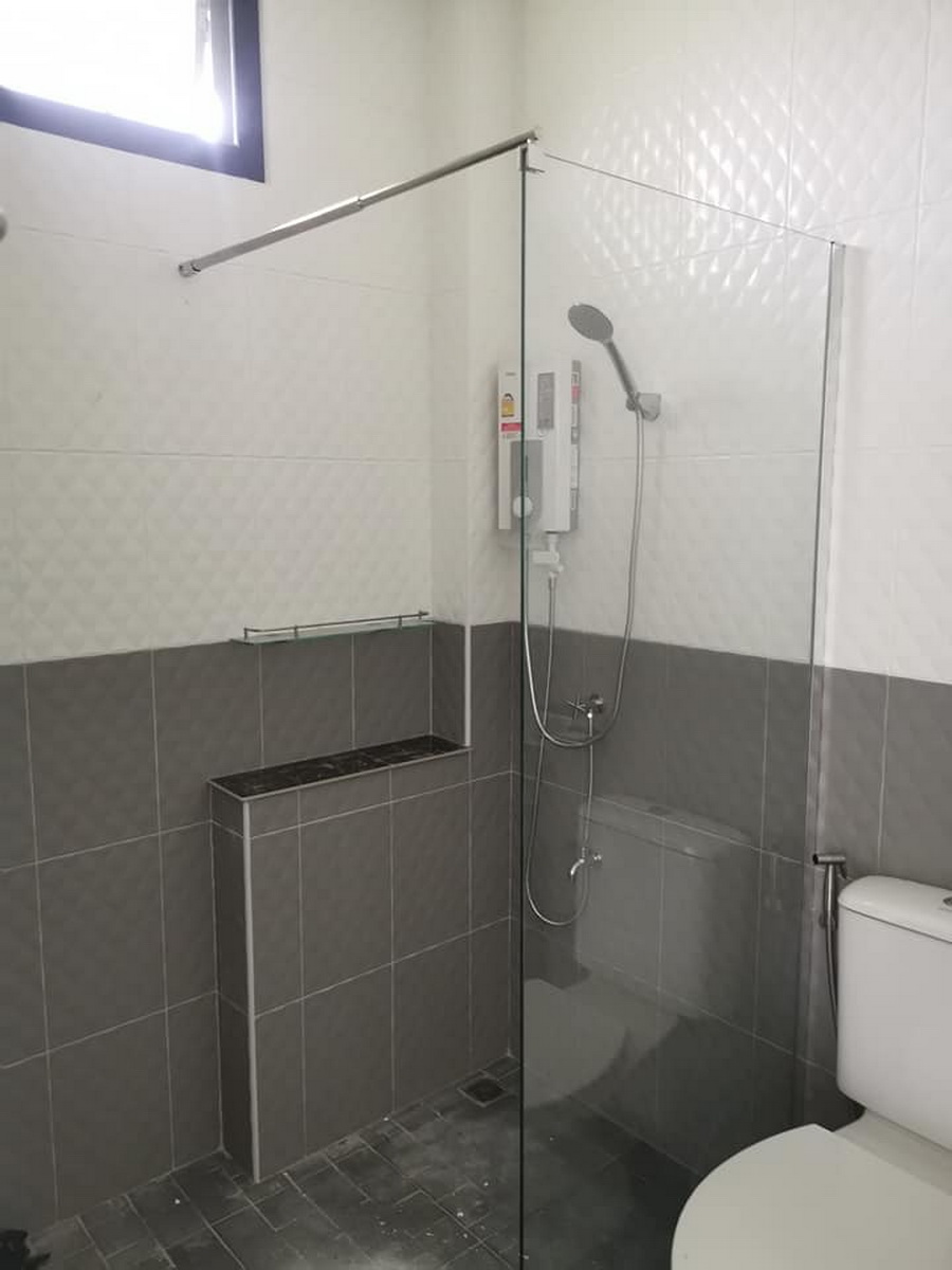 สำหรับห้องน้ำก็เช่นเดียวกับห้องครัวที่จะเน้นการใช้งาน ภายในจึงออกแบบและตกแต่งอย่างเรียบง่าย พร้อมกับแบ่งพื้นที่การใช้งานแบบแห้งและแบบเปียกได้อย่างเป็นสัดส่วน