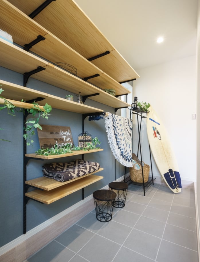 เมื่อเข้ามาด้านใน เราก็จะมาพบกับโถงเล็ก ๆ แห่งนี้ ซึ่งจะเป็นที่สำหรับถอดเก็บรองเท้า นอกจากนี้ สถาปนิกยังติดตั้งชั้นวางของเอาไว้ให้ใช้จัดเก็บข้าวของบริเวณนี้อีกด้วย