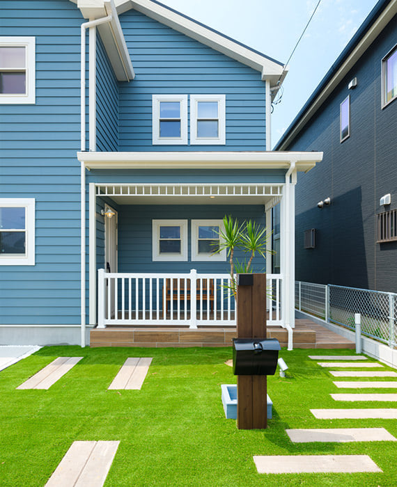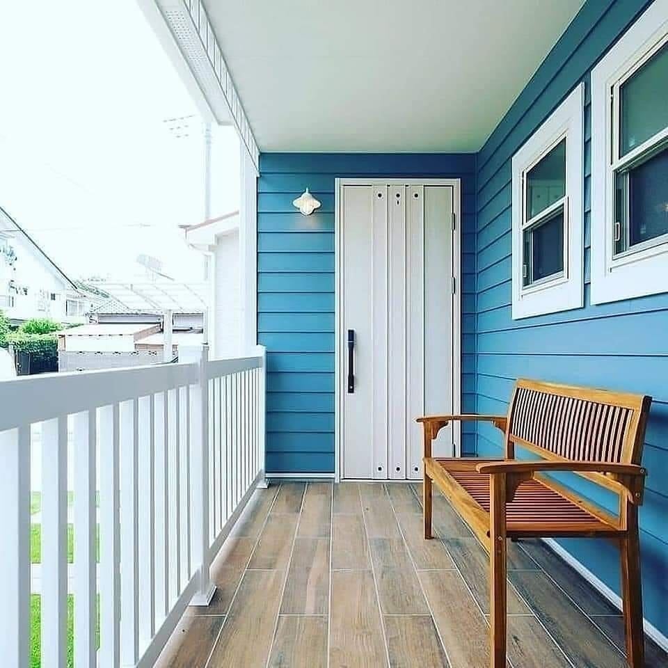 บริเวณหน้าบ้านจะมีระเบียงเล็ก ๆ พร้อมกับม้านั่งยาวเอาไว้ให้นั่งเล่น เพื่อผ่อนคลายอารมณ์ใกล้กับสนามหญ้าหน้าบ้าน