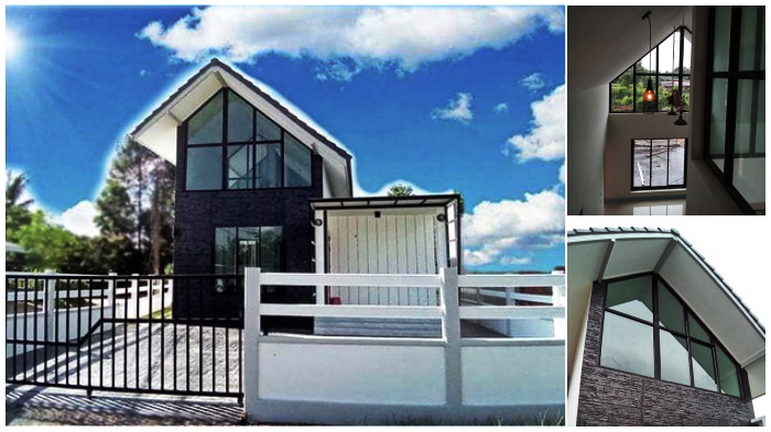ผนังภายนอกของบ้านตกแต่งด้วยโทนสีขาวเป็นหลัก ตัดกับโทนสีเทาจากผนังด้านหน้า และหลังคารูปทรงหน้าจั่วที่ให้ความสวยงาม และบรรยากาศที่อบอุ่นลงตัว
