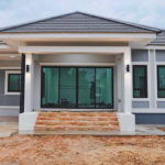 ลักษณะบ้านชั้นเดียว ออกแบบด้วยสไตล์คอจเทจ ตัวบ้านยกพื้นต่ำ ผนังภายนอกตกแต่งด้วยโทนสีแบบพาสเทลด้วยสีเขียวมิ้นท์ แซมด้วยสีขาว หลังคาของบ้านดีไซน์ด้วยหลังคารูปทรงปั้นหยาที่มุงด้วยกระเบื้องลอนสีอ่อน