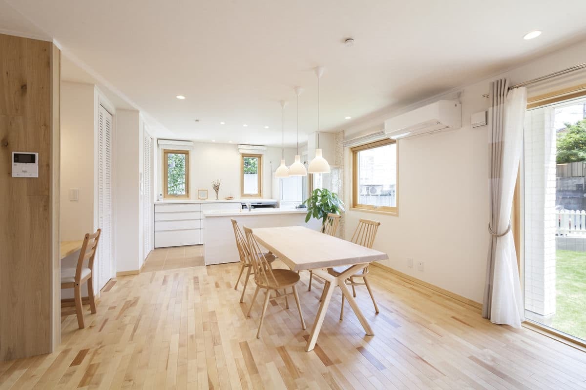 ถัดจากห้องนั่งเล่นก็จะเป็นมุมของพื้นที่โต๊ะรับประทานอาหารที่เลือกใช้วัสดุงานไม้สีอ่อน จึงทำให้มุมนี้ให้กลิ่นอายของความเป็นบ้านมินิมอลออกมาอย่างชัดเจน