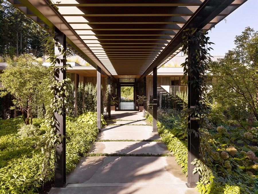 ทางเดินที่เชื่อมต่อกับตัวบ้านบริเวณนี้ออกแบบในลักษณะเป็นไม้ระแนงด้านข้างทั้งสองเป็นต้นไม้ที่เขียวขจี บริเวณเสายังมีเถาวัลย์พันเอาไว้ให้ดูเป็นธรรมชาติอีกด้วย