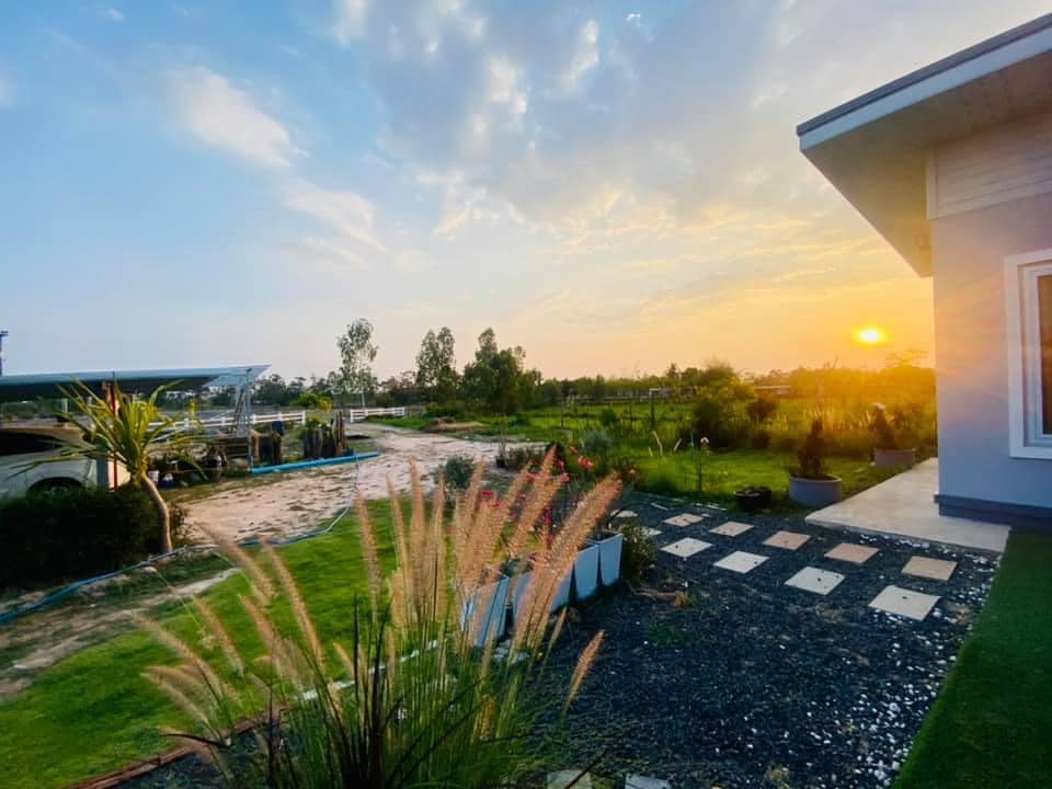 บรรยากาศหน้าบ้านมีความสวยงาม ช่วงเช้า ๆ ก็มีแสงจากดวงอาทิตย์สาดส่องมายังบ้านและพื้นที่สวน