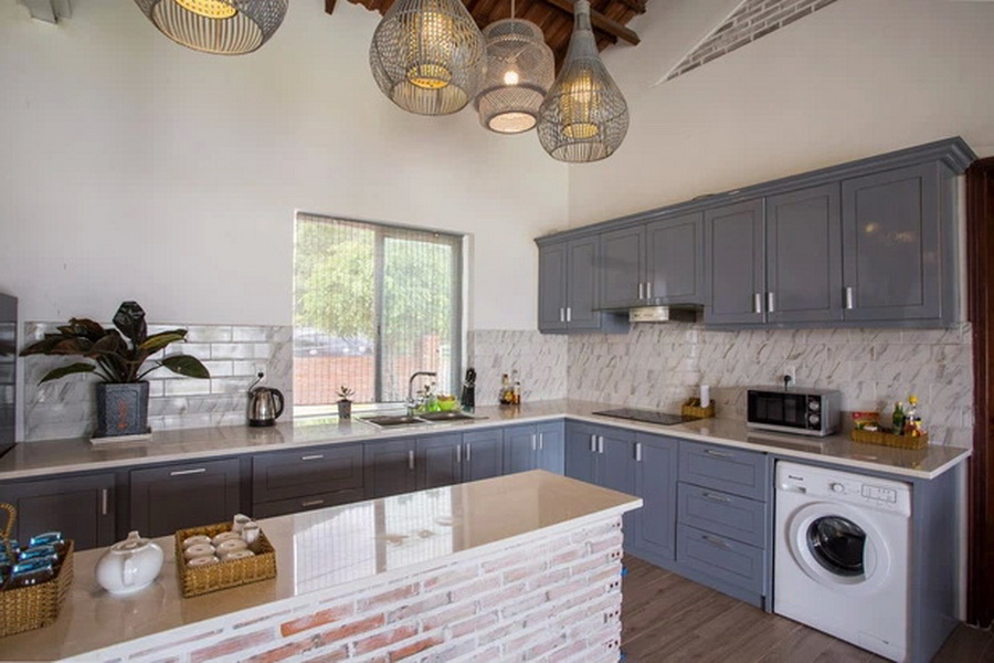 ภายในห้องครัวออกแบบและตกแต่งในแบบตะวันตก แบ่งเป็นพื้นที่เคาน์เตอร์ครัวแบบติดผนัง และเคาน์เตอร์ครัวแบบเกาะกลาง จึงสะดวกต่อการทำทุกเมนูอาหาร