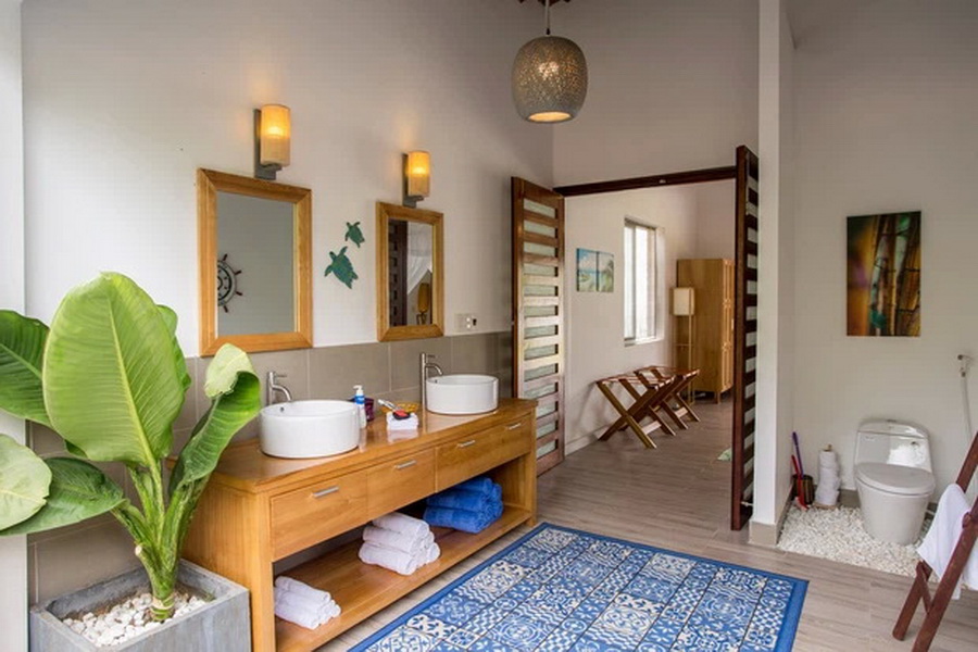 เช่นเดียวกันกับห้องน้ำ ที่เน้นพื้นที่ใช้สอยที่กว้างและโปร่งสบาย ภายในให้บรรยากาศแนวทรอปิคอล จึงเป็นอีกมุมหนึ่งที่เหมาะกับการหลบมาพักผ่อนอิริยาบถ