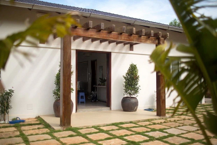 หน้าบ้านออกแบบเป็นเฉลียงที่ทอดยาวตลอดแนวบ้าน จึงมีพื้นที่กว้างให้จัดเป็นมุมเพื่อการพักผ่อน หรือทำกิจกรรมนอกตัวบ้านได้อย่างผ่อนคลาย