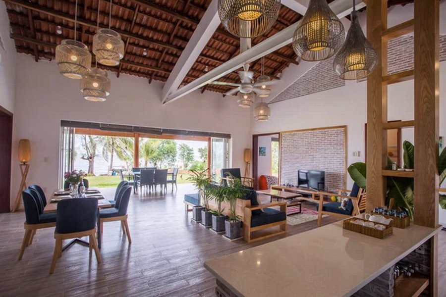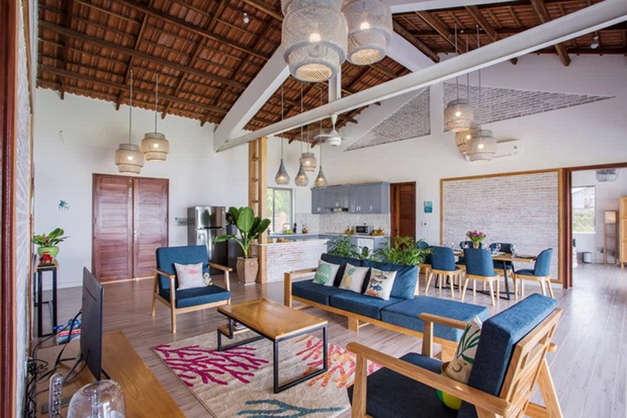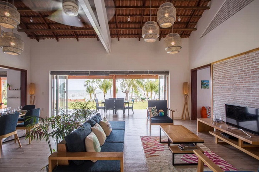 ห้องโถงหลังภายในบ้าน มีพื้นที่กว้างมาก เพดานเป็นแบบเปิดโล่ง ภายในห้องจะตกแต่งด้วยโทนสีและเฟอร์นิเจอร์ที่ให้บรรยากาศแบบเป็นธรรมชาติ รวมไปถึงโทนสีสว่างที่เข้ากับบรรยากาศชายทะเล