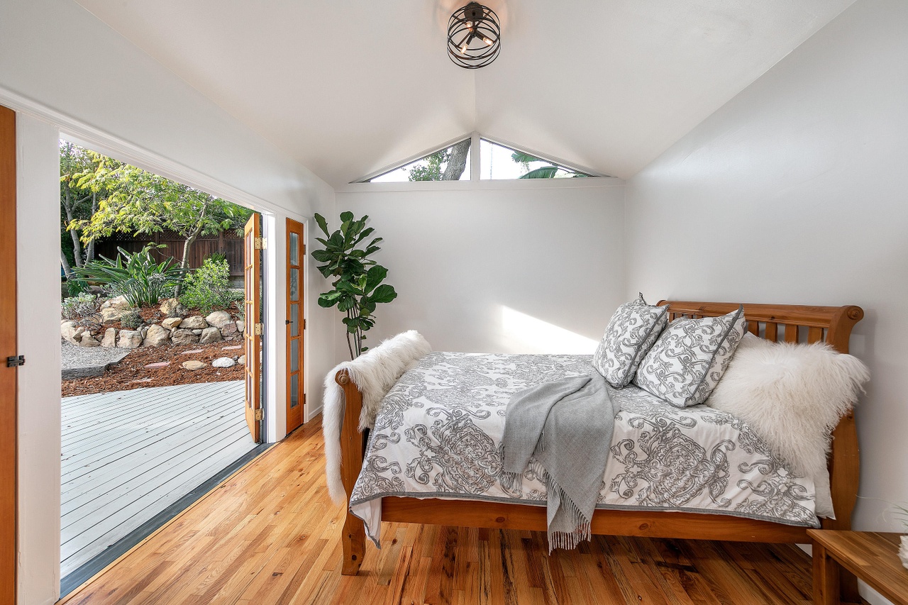 ภายในห้องนอนจะมีกลิ่นอายที่เรียบง่ายแบบมินิมอล โดยจุดเด่นจะอยูที่ผนังบานหนึ่งจะเป็นประตูบานพับที่สามารถเปิดได้กว้าง ซึ่งทางด้านทิศนี้ภายนอกจะเป็นวิวธรรมชาติมุมสูงนั่นเอง