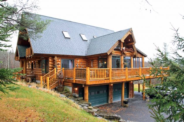 ตัวบ้านขนาดสองชั้น วัสดุภายนอกจะเป็นไม้ซุงเกือบทั้งหมด หลังคาสีน้ำเงินสุดคลาสสิค เมื่อมองจากภายนอกจะเห็นระเบียงชั้นสองที่ดูโดดเด่นและสวยงามเป็นอย่างยิ่ง ดูเข้ากับบรรยากาศสีเขียวรอบๆได้เป็นอย่างดี